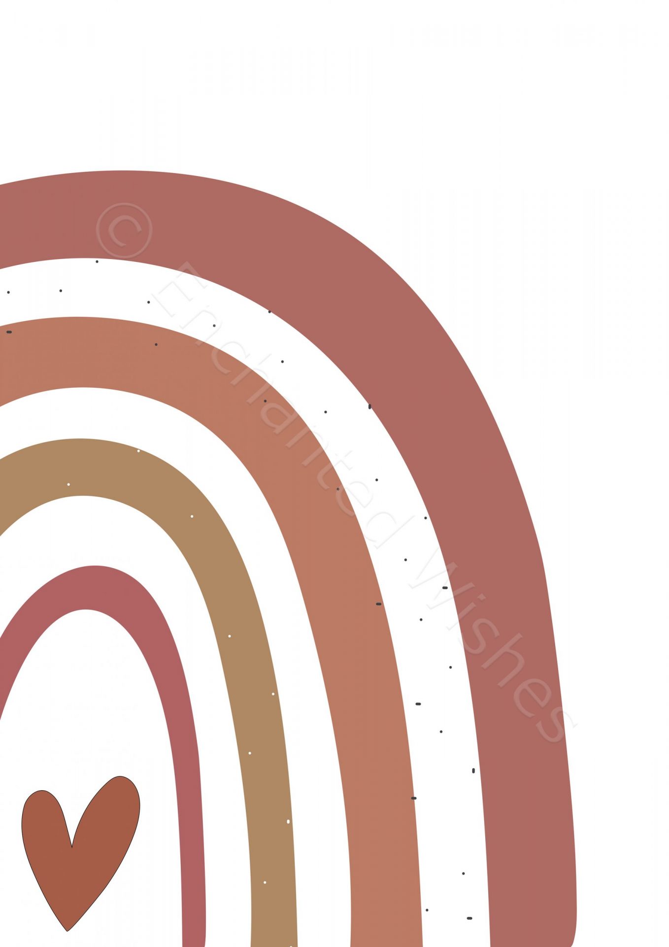 A lovely print featuring a simple half rainbow in the corner, with a heart at its centre. In shades of burnt orange and mustard.
